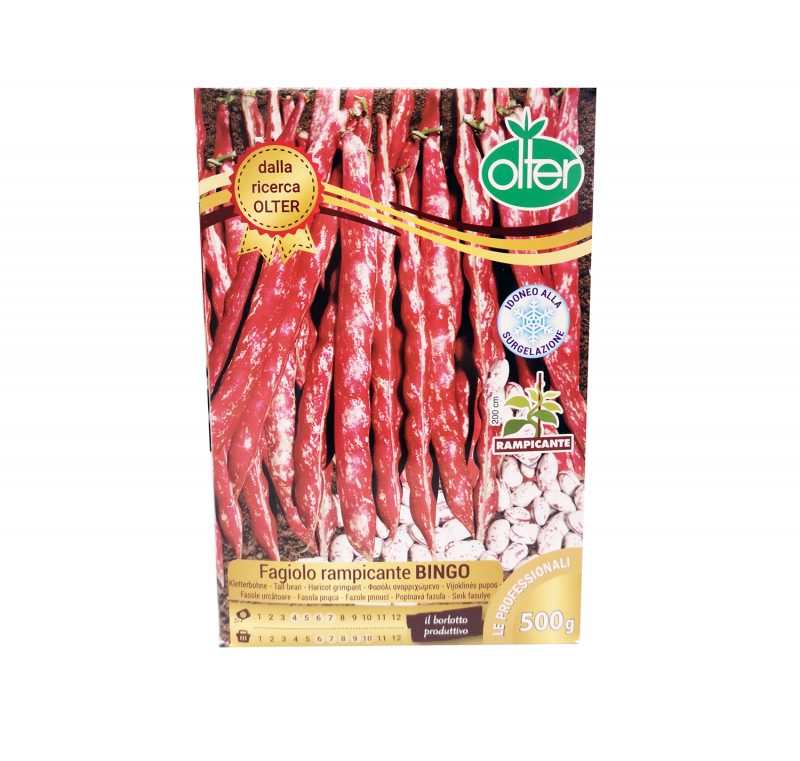 Tipologia borlotto rampicante a baccello diritto lungo 20/22 cm. con 7-8 grani crema con striature rosso intenso. Ciclo 90-95 gg. Vegeta bene anche a basse temperature.
